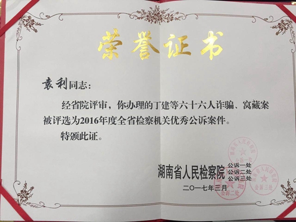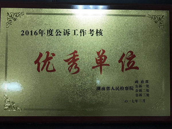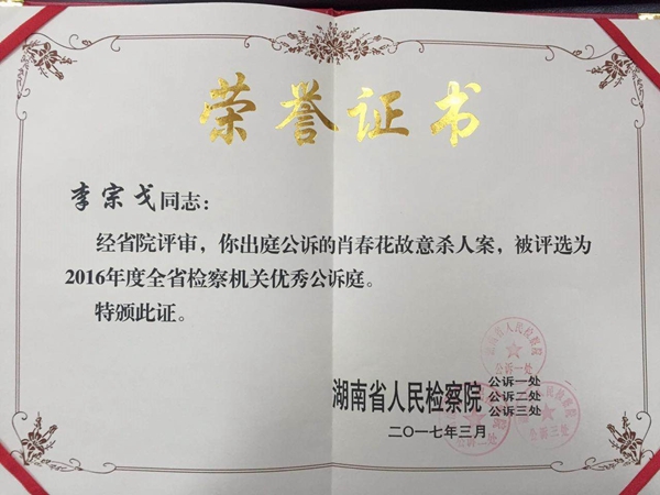 市检察院公诉部门在省院考核中成绩突出被评为“优秀单位”;市检察院党组成员、副检察长李宗戈出庭公诉的肖春华故意杀人案被评为“全省检察机关优秀公诉庭”;宁乡县检察院办理的丁建等六十六人诈骗、窝藏案被评为“全省检察机关优秀公诉案件”。