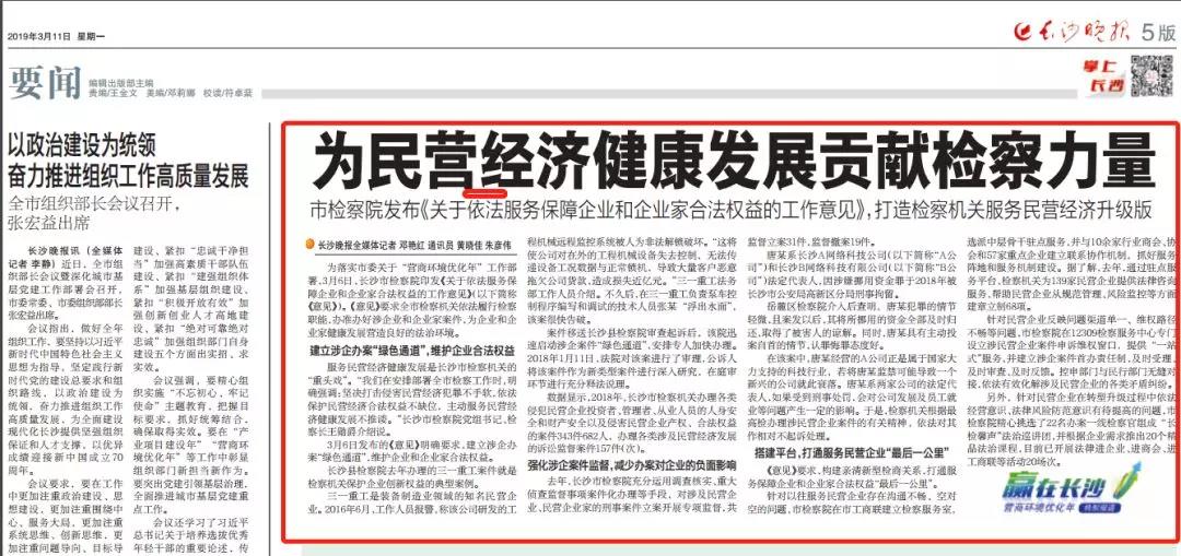 数据显示,2018年,长沙市检察机关办理各类侵犯民营企业投资者、管理者、从业人员的人身安全和财产安全以及侵害民营企业产权、合法权益的案件343件682人,办理各类涉及民营经济发展的诉讼监督案件157件(次)。