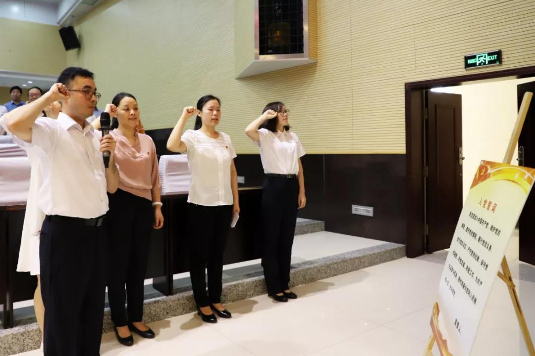 会议在雄壮的国歌声中开始,面对鲜红的党旗,四名新党员庄严宣誓,加入中国共产党。全体老党员重温入党誓词,新党员代表作入党表态发言。