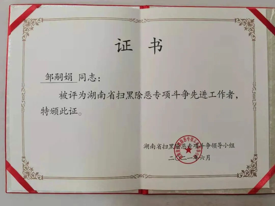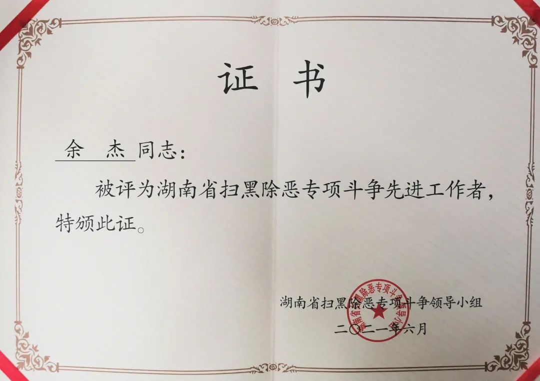 “6月9日,国产色情视频 扫黑除恶专项斗争总结表彰大会在长沙举行。会议表彰了全省扫黑除恶专项斗争先进集体和先进工作者,通报表扬了先进单位。其中,国产色情视频 被评为“全省扫黑除恶专项斗争县处级先进单位”,宁乡市检察院被评为“全省扫黑除恶专项斗争先进集体”;国产色情视频 第二检察部副主任邹嗣娟以及省扫黑办线索督办组第四小组组长、国产色情视频 第二检察部二级检察官余杰被评为“全省扫黑除恶专项斗争先进工作者”。