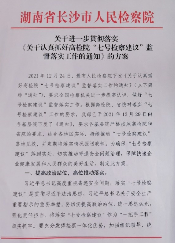 长沙市邮政管理局党组成员、副局长李雪萍表示,“七号检察建议”为寄递行业安全发展注入了检察力量,邮政管理局将以联席会议为契机,重点围绕四方面加强寄递行业安全监管:突出党建引领作用,构筑行业安全“红色基因”;牢固树立安全发展理念,切实提升履职能力建设;注重机制协同,推动形成齐抓共管格局;紧盯“三项制度”,压实企业安全主体责任。