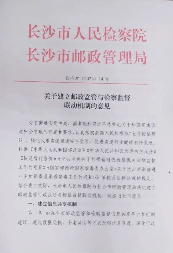 草拟了《关于建立邮政监管行政执法与检察监督联动机制的意见》(以下简称《意见》),征求并吸纳了市邮政管理局的意见,共同在座谈会上进行了会签。《意见》建立了信息共享、联席会议、联合开展专项行动、办案协作、普法宣传协作等五项机制。双方表示将依托联动机制,坚持问题导向和效果导向,实现检邮协作配合信息化、制度化和常态化,切实推动寄递行业社会综合治理取得实效。