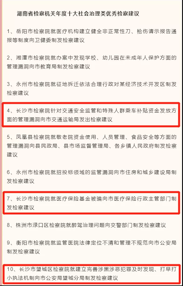 检察院召开新闻发布会,发布全省检察机关年度10大社会治理类优秀检察建议,其中,长沙检察机关发出的检察建议占了3席。长沙检察机关发出的这些检察建议,有效推动了交通安全整治、堵塞交通安全管理漏洞、完善交通运输管理机制;有效推动了医保基金使用更加安全,守护好老百姓看病的“钱袋子”;推动完善了扫黑除恶长效治理机制。
