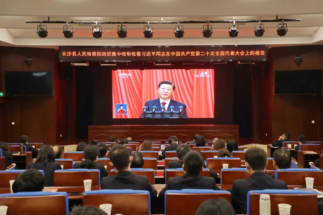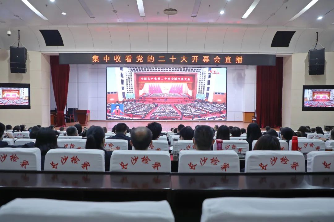 全体检察人员集中观看中国共产党第二十次全国代表大会开幕会,认真聆听习近平总书记所作的工作报告。大家表示,报告内容催人奋进,令人倍感振奋、深受鼓舞。我们要在以习近平同志为核心的党中央坚强领导下,高举中国特色社会主义伟大旗帜,全面贯彻习近平新时代中国特色社会主义思想,深刻领悟“两个确立”的决定性意义,增强“四个意识”、坚定“四个自信”、做到“两个维护”,弘扬伟大建党精神,自信自强、守正创新,踔厉奋发、勇毅前行,为全面建设社会主义现代化国家、全面推进中华民族伟大复兴而团结奋斗!作为新时代检察人员,我们更要始终坚持党对检察工作绝对领导,自觉做习近平新时代中国特色社会主义思想的坚定信仰者,做习近平法治思想的忠实实践者。始终坚持以人民为中心,把司法为民融入检察人员精神血脉,以强有力的检察作为,为长沙全面实施“强省会”战略担当尽责、作出积极贡献,用实际行动和工作实效来诠释对党对人民对宪法法律的绝对忠诚!