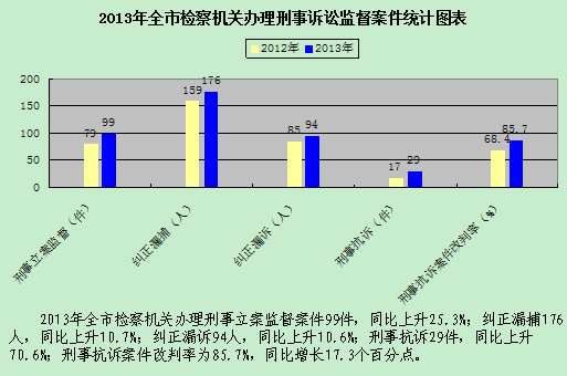 2013年,全市检察机关在市委和省人民检察院的正确领导下,在市人大及其常委会的有力监督和市政府的关心支持、市政协的民主监督下,认真贯彻党的十八大会议精神,忠实履行宪法和法律赋予的职责,主动服务全市工作大局,坚决维护公平正义,检察工作全面、深入推进,取得了新进展。