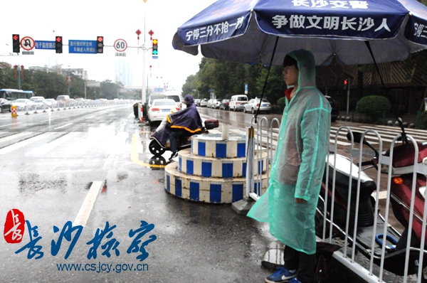 当天下午,天空下着小雨,天心区检察院志愿者们按时来到指定路口,对行人闯红灯、不走人行横道、自行车走机动车道、翻越栏杆、乱扔垃圾等交通不文明行为进行劝阻和制止,提醒他们遵守交通法规,服从交通指挥,做文明市民,减少道路交通事故的发生。“斑马线上文明一小步,城市文明形象将提升一大步。希望大家都能遵守交通规则,文明出行。”虽然衣服和鞋都被雨水淋湿,但志愿者们不惧风雨,坚守在岗位上,构成了一道亮丽的风景线。