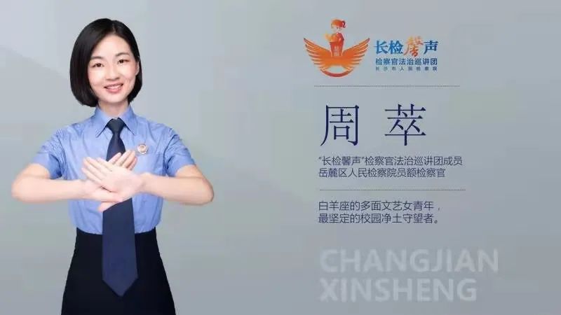 周萃同志担任未检专干以来,她立足检察职能,坚持用新方法、新视角,深入校园、街镇、社区开展巡讲,通过更多的互动、体验,将未检工作向社会全方位展示,加深学生对法律知识的理解,增进了少年儿童对检察机关的认识。根据不同阶段未成年人的心理特征,她不拘泥于常规普法模式,巧妙地以“微电影”+“模拟法庭”+“法治课堂”相结合的模式向中小学生进行普法宣传,以“微电影”+“情景剧”+“检察官来信”相结合的模式向低龄幼儿及家长推送普法信息。先后定制了“反校园欺凌”“防拐骗”“防性侵”等多个主题的法治课堂,其中针对低龄儿童的“防拐骗”普法课堂,在长沙市“长检馨声”检察官法治巡讲团优秀课件评比中荣获第一名;自编自导编排了儿童普法剧《大灰狼落网记》,更受到社会一致好评。疫情期间,她不断更新、完善法治课程的宣传模式,又以剪纸卡通形象结合真实案例改编了微影剧《可怕的谎言》《爱慕虚荣的灰大狼》,将预防和保护的种子播撒开,受到检察日报的高度关注。