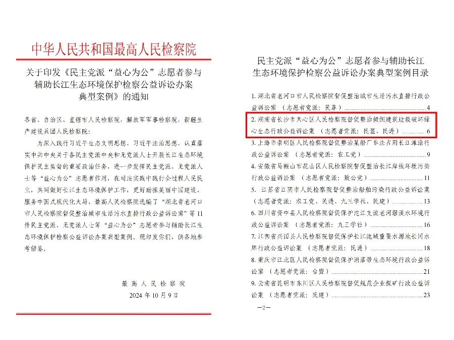 近日,最高人民检察院发布《民主党派“益心为公”志愿者参与辅助长江生态环境保护检察公益诉讼办案典型案例》,国产色情视频 长沙市天心区人民检察院督促整治倾倒建筑垃圾破坏绿心生态行政公益诉讼案成功入选。