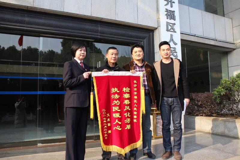 2月24日下午,雪后初晴。文某来到长沙市开福区人民检察院,激动地紧握着公诉科黄检察官的手说:“感谢检察机关秉公执法,免除了我的牢狱之灾!”并向该院赠送一面锦旗。