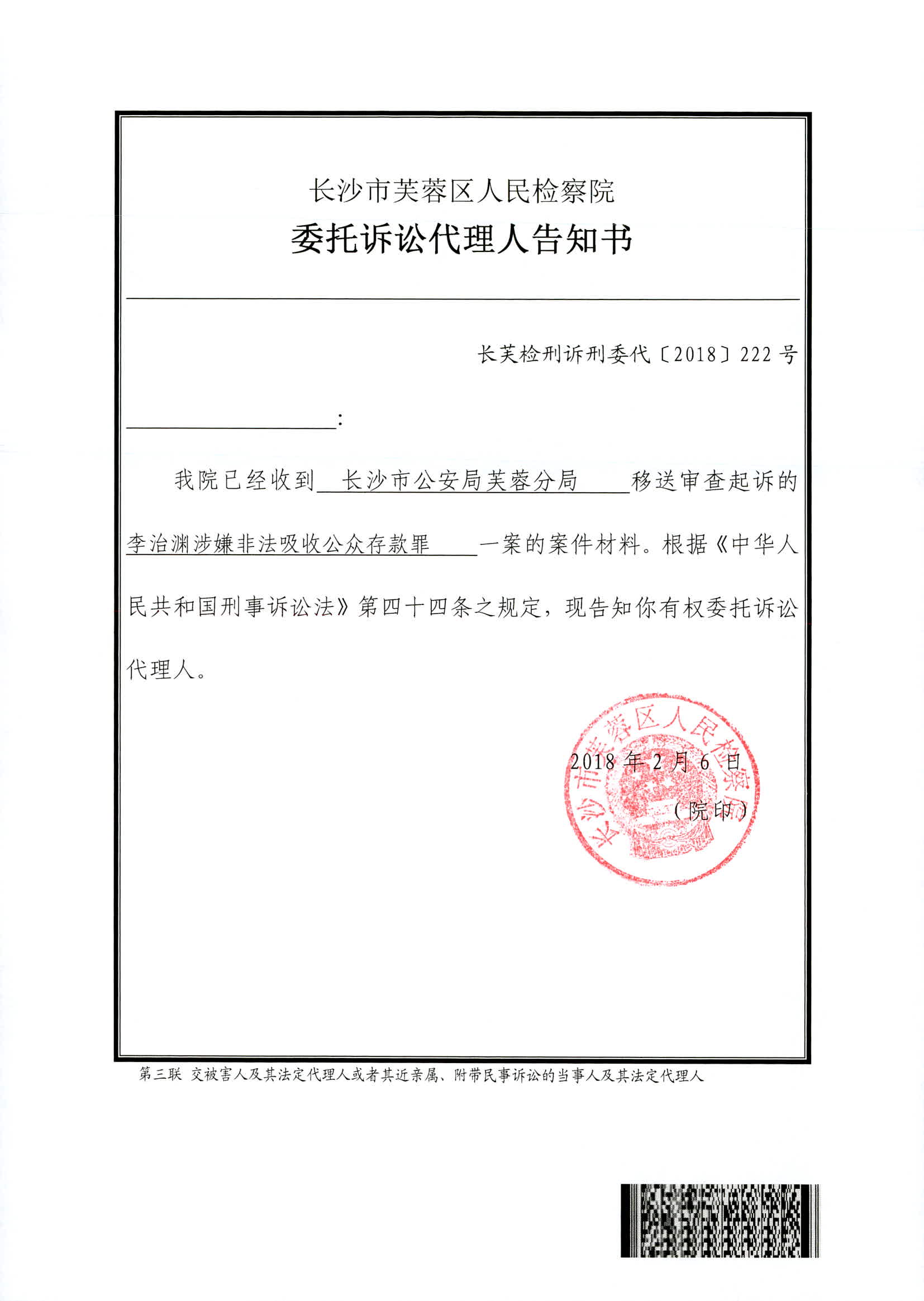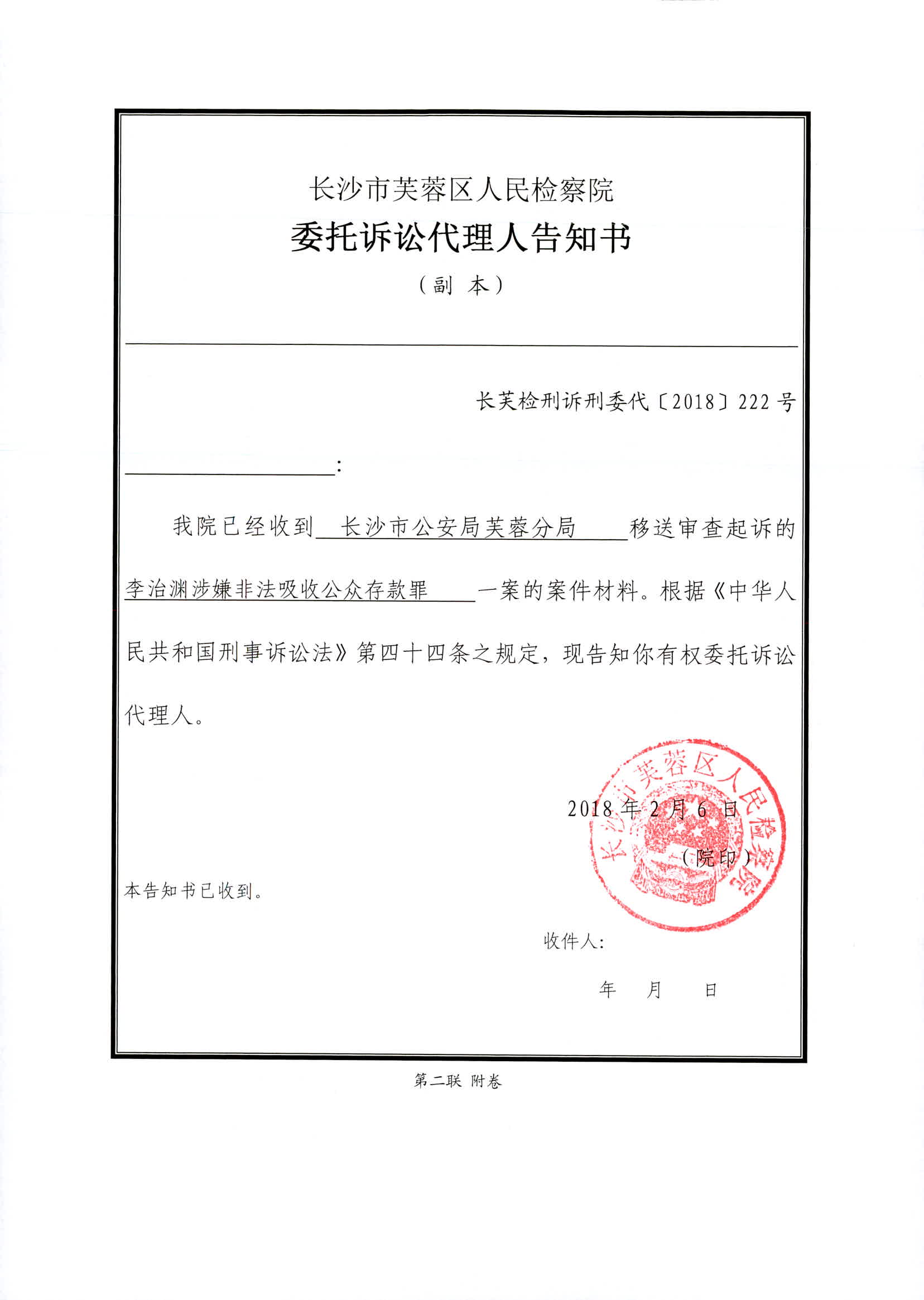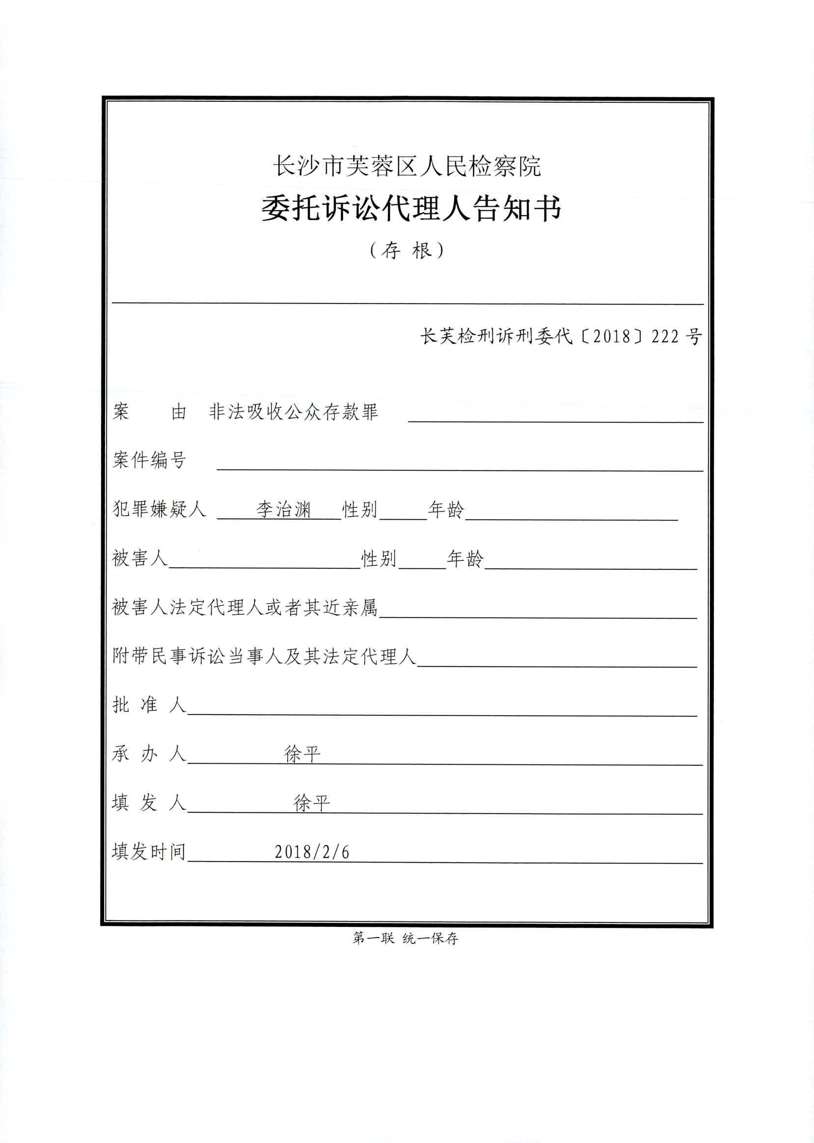 李治渊涉嫌非法吸收公众存款罪权利义务告知书