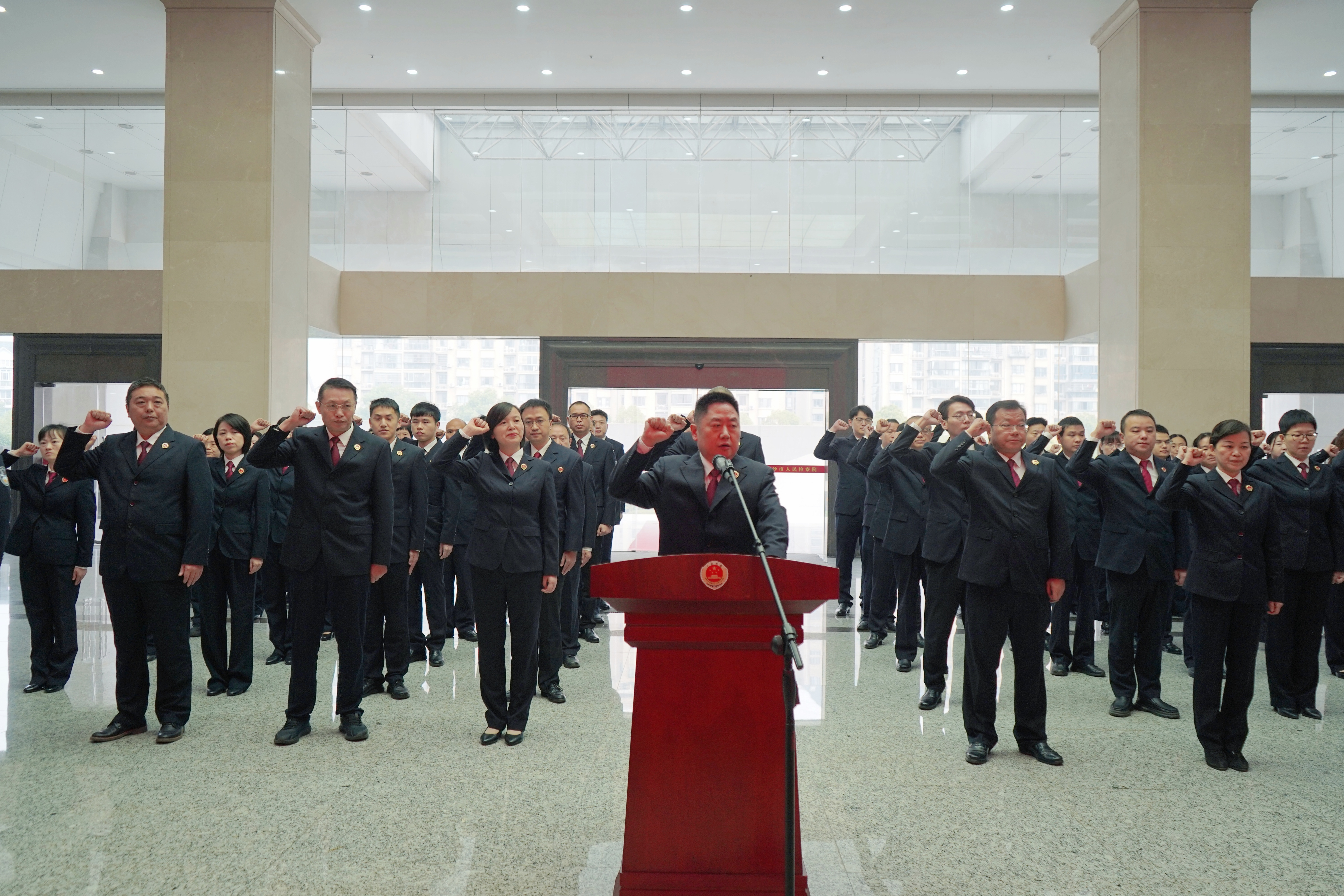 在庄严的国歌声中,宣誓仪式拉开了序幕。领誓人左手抚按《中华人民共和国宪法》,领诵誓词,宣誓人员紧随其后,右手举拳,拳心朝前,跟诵誓词,声音坚定而有力,彰显了检察人员对宪法的忠诚与誓言的庄严。