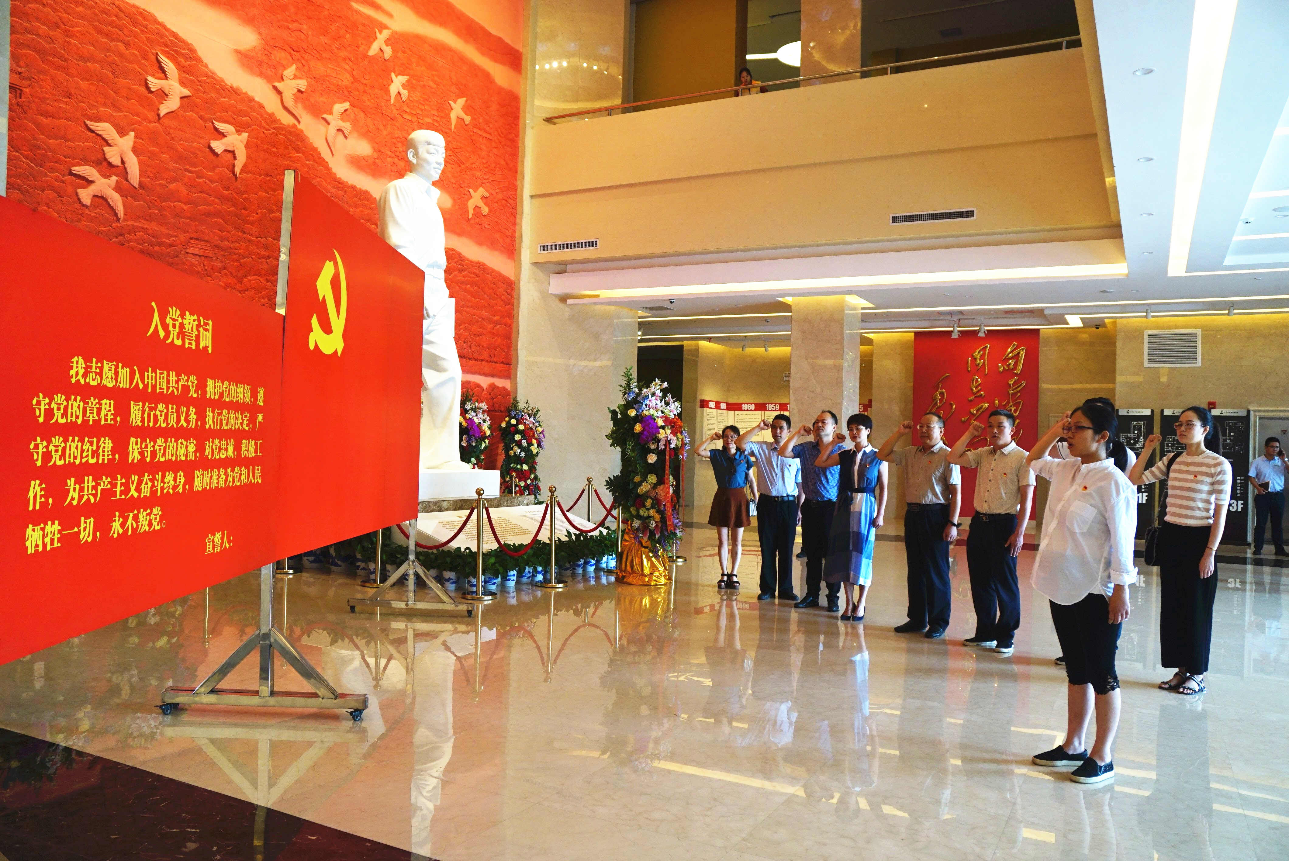 在参观雷锋纪念馆前,第一支部的全体党员向雷锋同志敬献花篮,在党支部书记史寒君的带领下,面向党旗,庄严宣誓,重温入党誓词。随后,大家跟随讲解员的脚步,通过实物、照片以及由高科技手段复原的虚拟影像等多种方式对雷锋同志的成长过程和雷锋精神的形成过程进行全面深入的了解。