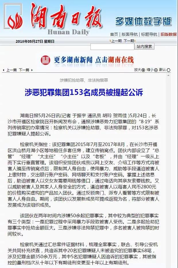 2018年5月24日,开福区检察院召开新闻发布会,通报涉嫌恶势力犯罪集团的“8·19”系列传销案的办案情况,该院依法以涉嫌抢劫罪、非法拘禁罪对153名涉恶犯罪嫌疑人提起公诉。该犯罪集团涉及犯罪事实50余起,涉案金额300余万元。