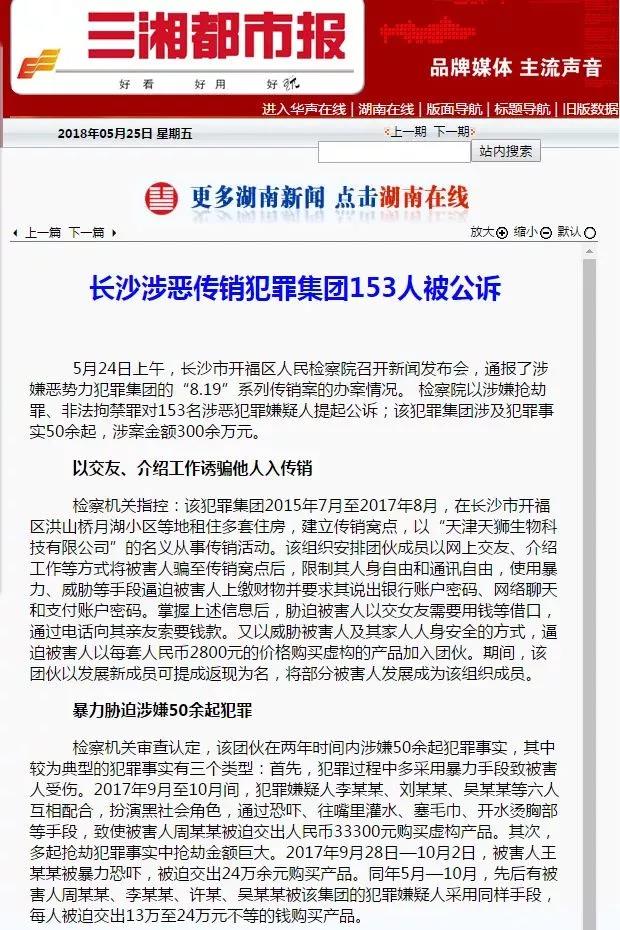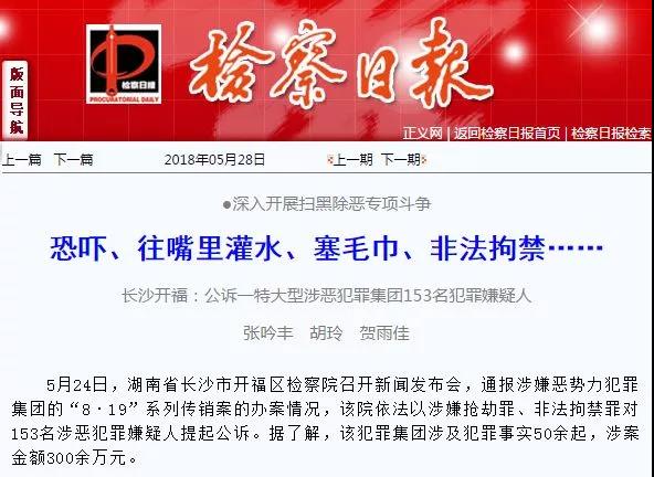 2018年5月24日,开福区检察院召开新闻发布会,通报涉嫌恶势力犯罪集团的“8·19”系列传销案的办案情况,该院依法以涉嫌抢劫罪、非法拘禁罪对153名涉恶犯罪嫌疑人提起公诉。该犯罪集团涉及犯罪事实50余起,涉案金额300余万元。