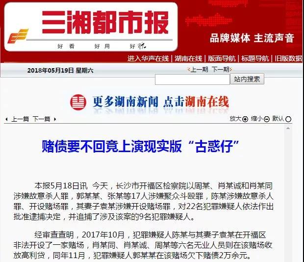 2018年5月18日,开福区检察院以周某、肖某诚和肖某同涉嫌故意杀人罪,郭某某、张某等17人涉嫌聚众斗殴罪,陈某涉嫌故意杀人罪、开设赌场罪,其妻子袁某涉嫌开设赌场罪,对22名犯罪嫌疑人依法作出批准逮捕决定,并追捕了涉及该案的9名犯罪嫌疑人。